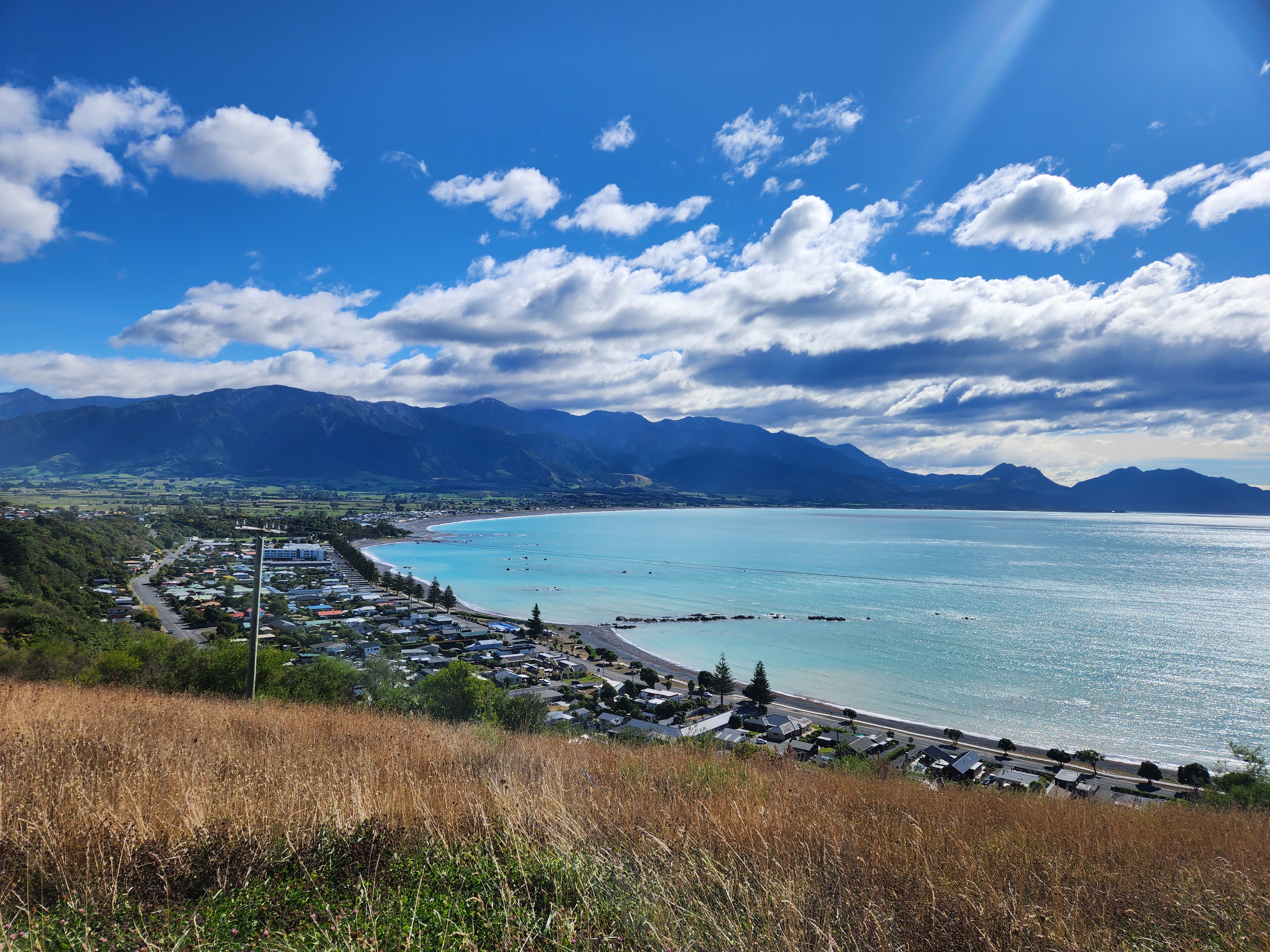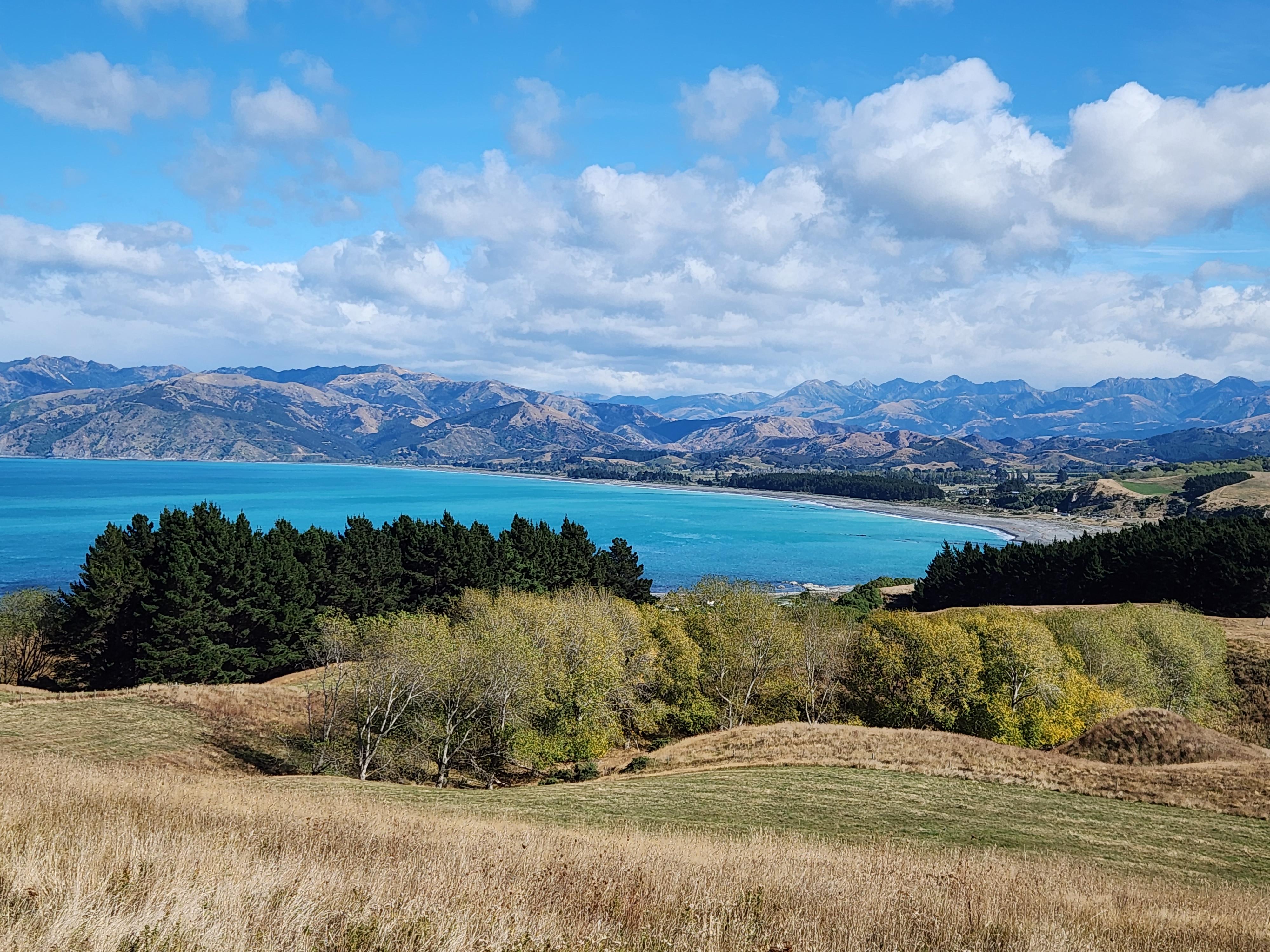 왼쪽으로 방향을 돌리자 구츠베이가 보였다. 저 해안을 따라 우리가 온 길이 있다. 큰 만이다. 옥색바다가 멋지다. 만 뒷편으로 제법 높은 산맥이 이어져 있다. 카이코우라 산맥이다. 두 줄기 산맥이 나란하게 100km 정도 이어져 있다. 최고봉은 내륙 산맥의 타푸아에 오 우에누크산으로 2,885m이다. 해안 쪽 산맥에서는 마나카우산이 2,610m이다. 백두산 높이이다. 제법 높은 산맥이다. 오는 길이 힘들었던 이유가 바로 이 산맥 때문이었다. 산에 나무가 많지 않은 것을 보니 건조한 기후이다.