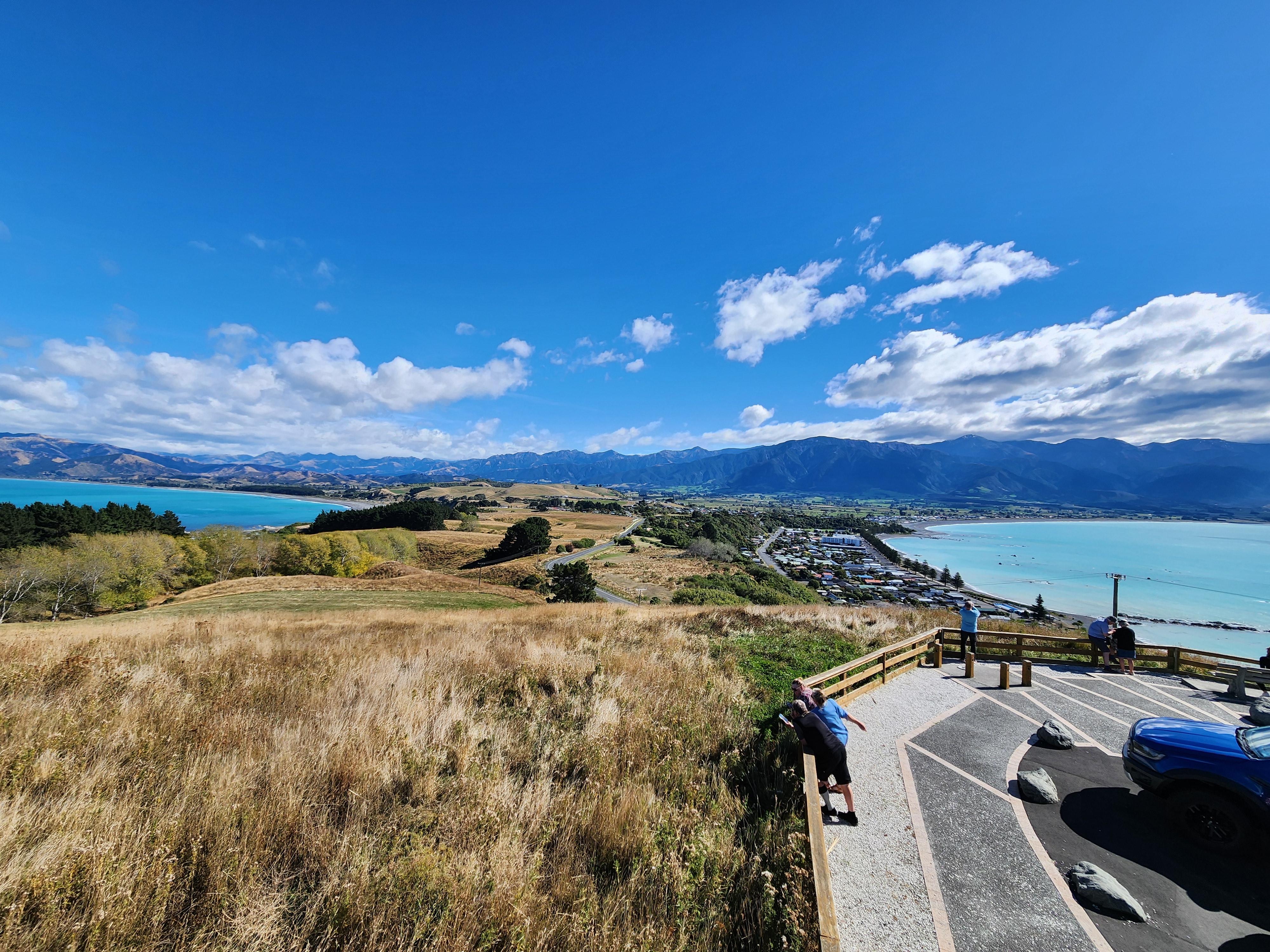 카이코우라를 방문하기로 했다. 크라이스트처치에서 180km로 2시간 반 정도 걸린다. 카이코우라는 마오리 말로 카이는 음식, 코우라는 크레이피시라고 한다. 크레이피시를 먹는 곳이다. 크레이피시는 랍스터와 비슷한데 집게발이 없다고 한다. 유튜브에도 관련 영상이 많았다. 우리도 크레이피스를 맛보기 위해서 출발했다. 1번 고속도로를 따라서 북쪽 방향으로 계속갔다. 크라이스트처치를 빠져나오자 와이너리가 많았다. 한참 평지로 이어지던 길은 길고 긴 계곡 속으로 들어갔다. 콘웨이강가를 따라 이어지더니 다시 오르막과 구불거림이 심해졌다. 2차로 밖에 안되는 길이어서 뉴질랜드를 대표하는 고속도로라고 믿기 어려웠다. 한참을 달리자 오라로라는 작은 마을을 지나고 해변을 따라 도로가 이어졌다. 기대했던 해안 드라이브이다. 해안절벽도 나타났다. 일부 구간에서는 작은 터널을 지났다. 마침내 카이코우라 전망대에 도착했다. 카이코우라반도에서 제일 높은 곳이다. 사방이 확 트여있다. 날씨는 눈부시게 맑았다. 카이코우라비치와 옥색 바다가 펼쳐져 있었다. 아름다움에 감탄사를 연발했다.