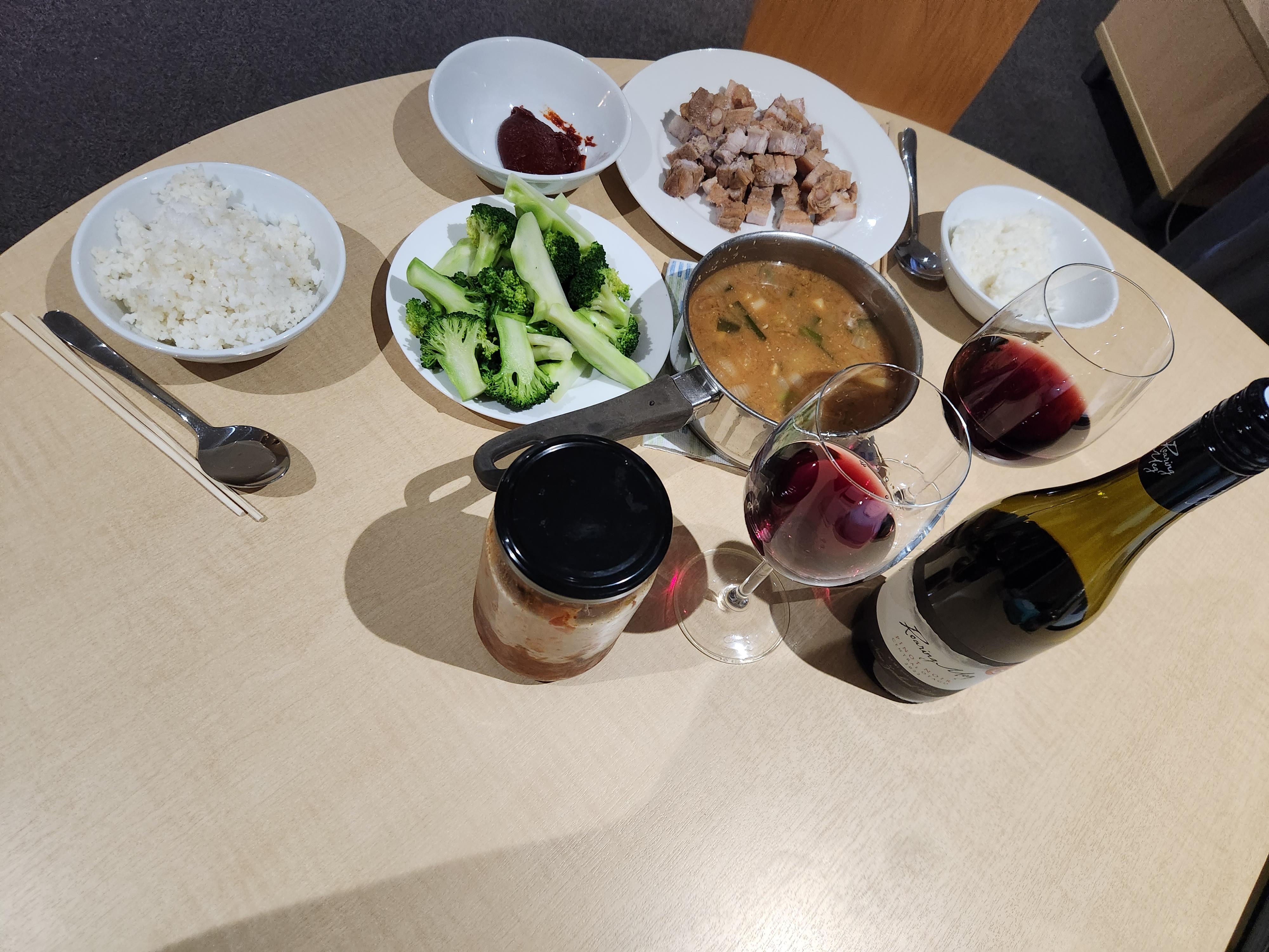 숙소에는 부엌이 잘 갖추어져 있다. 오늘 저녁은 돼지고기 수육과 된장찌게이다. 뉴질랜드에서는 육류 가격이 매우 저렴하다. 오타고 지역의 피노누아 와인을 곁들였다. 이제 얼마 남지 않은 뉴질랜드 여행을 되돌아 보았다.