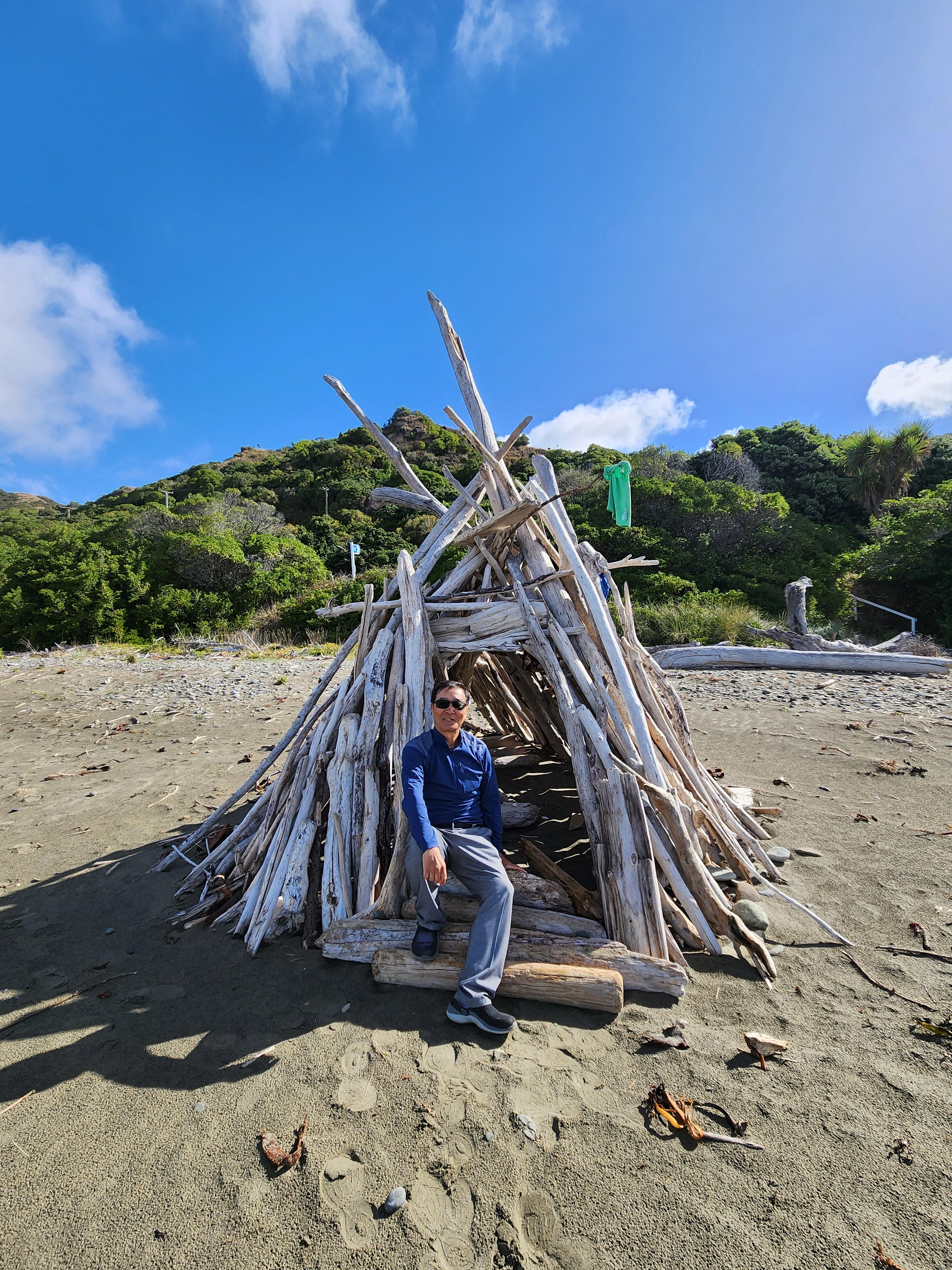 해변에는 재미있는 구조물이 많았다. 캠핑장에서 만든 것일지도 모르겠다. 해변에 밀려온 나무를 이용한 것 같다. 사진을 찍는 포인트 같았다. 건미도 포즈를 취했다.